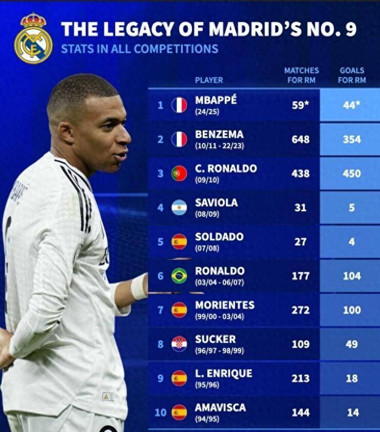 2024年夏窗姆巴佩空降伯纳乌时,俱乐部为他准备的9号球衣还带着前任本泽马的余温。 法国前锋在2024/25赛季前5轮联赛就轰进7球,但谁也没想到这份数据单会成为皇马9号近十年最寒酸的开局。